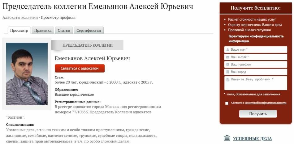 Алексей Юрьевич Емельянов - председатель коллегии «Бастион». Состоит в Адвокатской палате Москвы, Федеральном союзе адвокатов РФ, Международном Содружестве, Ассоциации юристов РФ. Профессиональная практика насчитывает боле 20 лет.