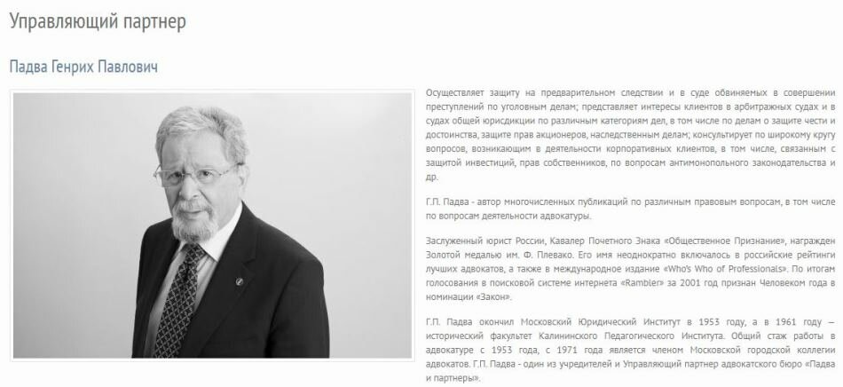 Генрих Павлович Падва является советским адвокатом, заслуженным юристом РФ. Удостоен Золотой медали имени Плевако. Имя юриста неоднократно упоминалось в российских рейтингах лучших специалистов, а также международном издании «Who’s Who of Professionals». На голосовании Rambler в 2001 году Генриху Павловичу присвоен статус Человека года в номинации «Закон». Лучший юрист Москвы защищает интересы клиентов при предварительном следствии, в суде. Предоставляет консультации по широкому спектру жилищных вопросов.